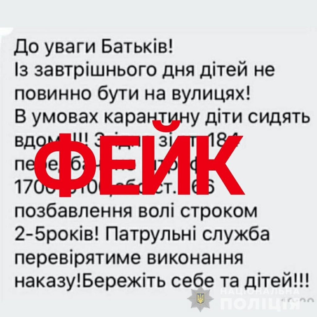 Фейки, чутки та відверта неправда має різноманітний характер: починаючи від фейку про розпилення вночі дезінфікуючих засобів із гелікоптерів над спальними районами великих міст і завершуючи забороною прогулянок із дітьми вулицями Києва під загрозою адміністративної та кримінальної відповідальності.