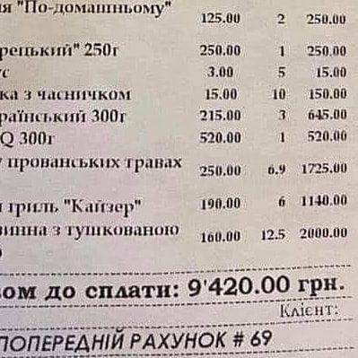 На один чек людина витрачає майже дві мінімальні місячні зарплатні. А якщо захотілось відсвяткувати і замовити горілочки, то судячи з ціни, її вам доставлять на літаку прямісінько із заводу.