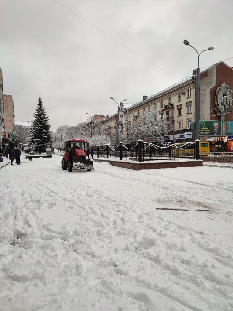 Зранку працівники комунальних підприємств розчищають від снігу та посипають піскосумішшю зупинки громадського транспорту, тротуари, дороги до важливих інфраструктурних об’єктів.