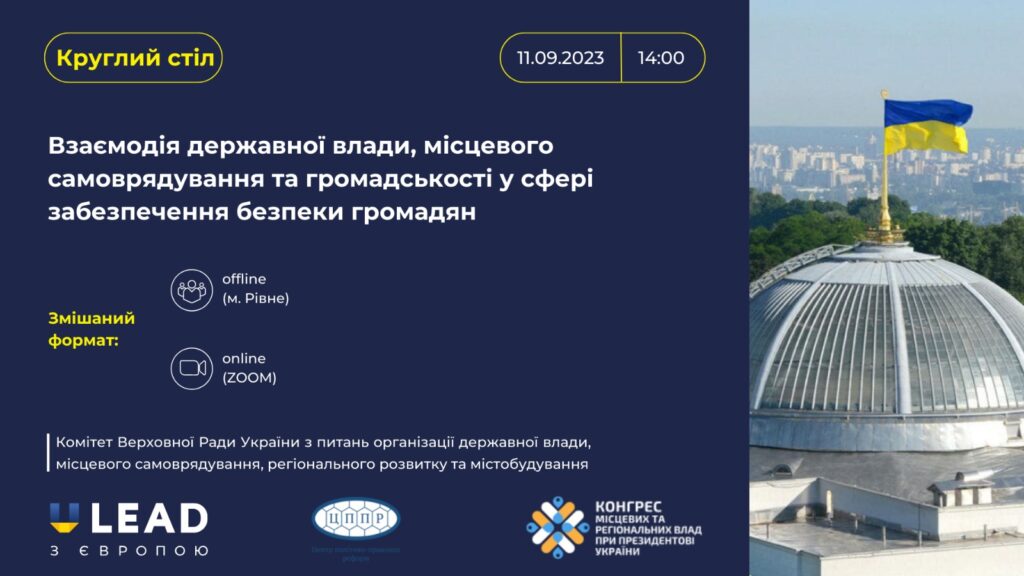 11 вересня о 14:00 відбудеться круглий стіл на тему «Взаємодія державної влади, місцевого самоврядування та громадськості у сфері забезпечення безпеки громадян». Захід відбудеться у змішаному форматі. Наживо у м. Рівне та у режимі відеоконференції на платформі ZOOM.