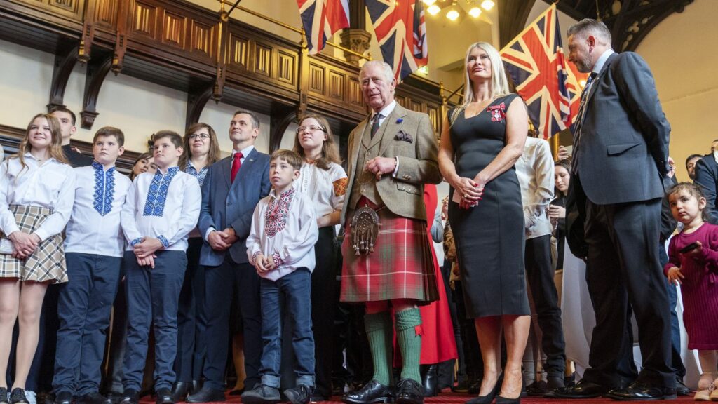 Фото: Король Чарльз III під час візиту до Абердінського міського будинку на зустрічі з родинами, які оселилися в Абердіні з України, Афганістану та Сирії (SkyNews).