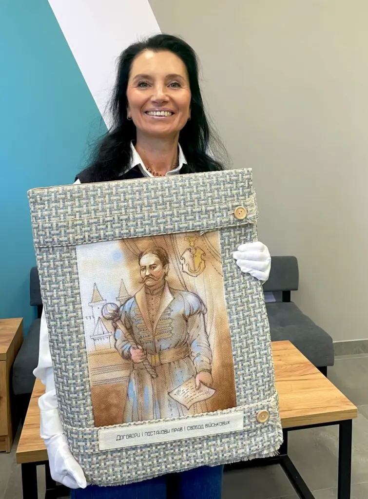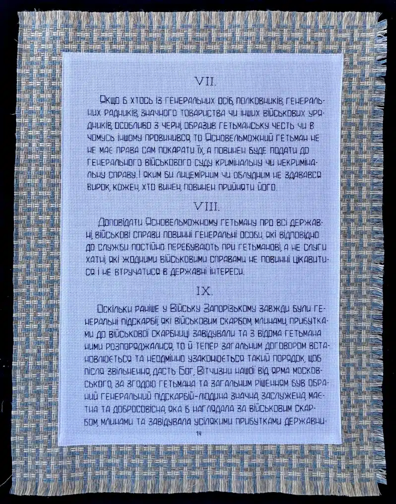 «А хіба можуть не викликати повагу формулювання про совісність гетьмана, яку він має сповідувати у веденні всіх справ?» – Олена демонструє черговий вишитий розділ. – Задля добра він повинен проявляти свою мудру турботу та владу, йому «належить усі негаразди Вітчизни нашої виправляти», охороняти права та свободи. Тут зафіксована норма, що коли він щось порушить, то «Генеральна Старшина, полковники і генеральні радники будуть уповноважені вільними голосами» висловити осуд і «докір щодо порушення прав та вольностей».