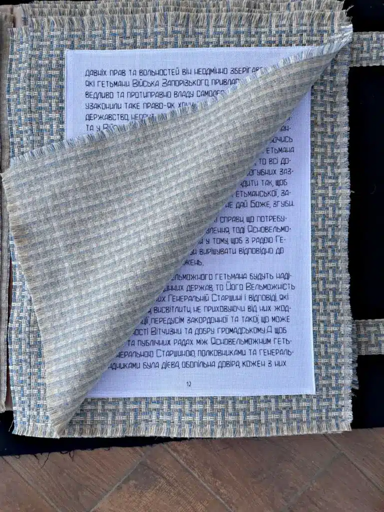 «Цей маніфест свідчить про закладання засад гуманізму та суспільної рівності і поваги, – продовжує вишивальниця й розгортає розділ XI. – Гетьман знав, що свободу Україні можна буде здобути лише в бою, а, отже, поляже багато українських воїнів… Тому турботою слід оточити тих, у кого загинув годувальник сім′ї: «Вдови-козачки й осиротілі діти козацькі», щоб до «всяких громадських повинностей не притягалися і сплатою податків не обтяжувалися…». Таку ж пільгу повинні мати і «двори козацькі й жінки в час відсутності козаків, які перебувають в походах або на якійсь іншій військовій службі».