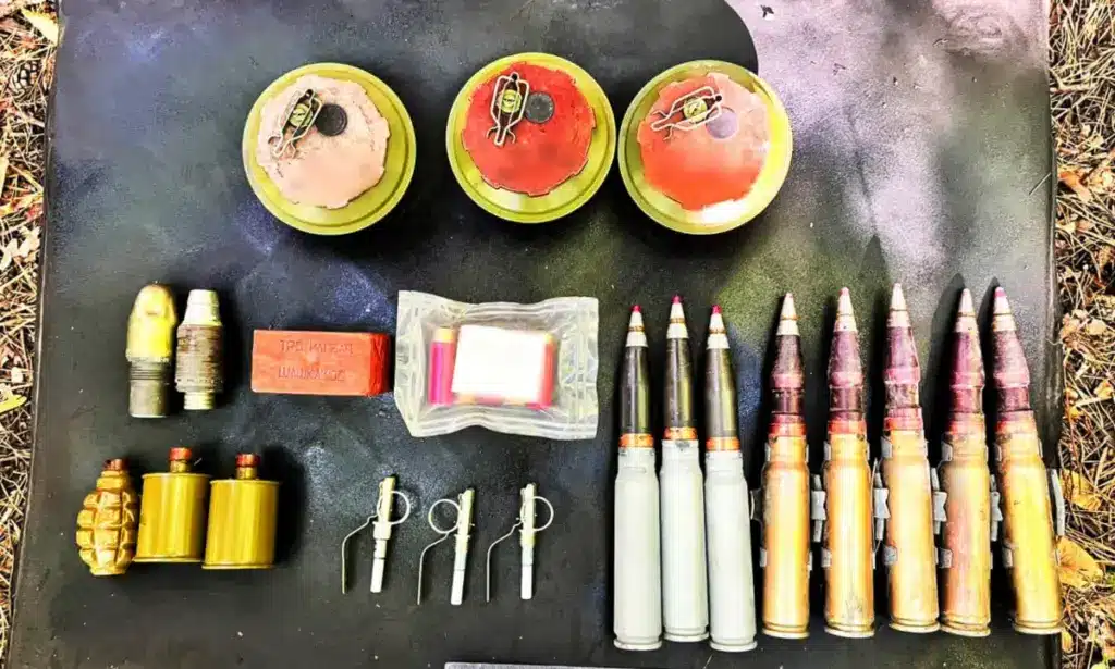 Вибухотехніки виявили там тротилову шашку вагою 400 грамів, 3 гранати, 4 запали до ручних гранат, 3 підривачі до протитанкової міни, артилерійський снаряд, гранату до підствольного гранатомета, 8 пострілів унітарного спорядження та 5 сигнальних ракетниць.