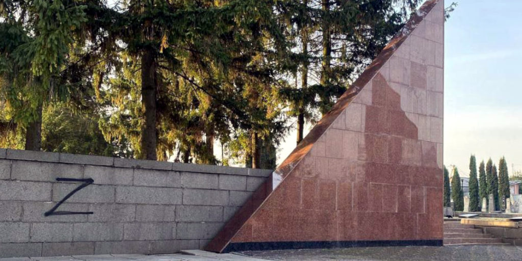 Зловмисники чорною фарбою на бетонному огородженні намалювали літеру «Z», яка є символом російських військ. Крім того, написи зробили й на зворотній стороні стели.