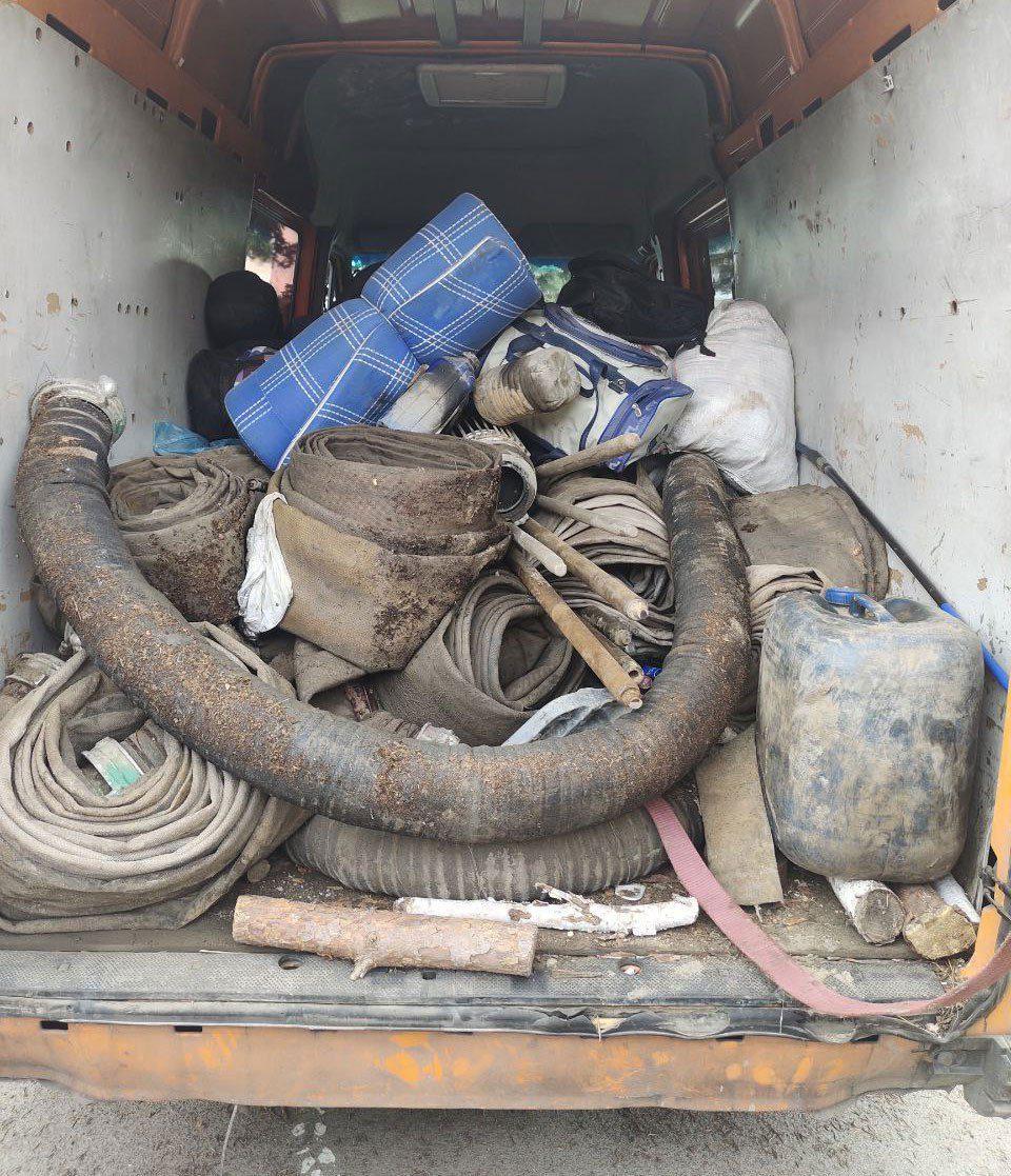 Як повідомили у Поліції Рівнещини, крім того, за оперативною інформацією у селі Рокитне працівники поліції зупинили автомобіль «Mercedes-Sprinter»: у салоні виявили та вилучили 30 одиниць обладнання для незаконного видобутку бурштину