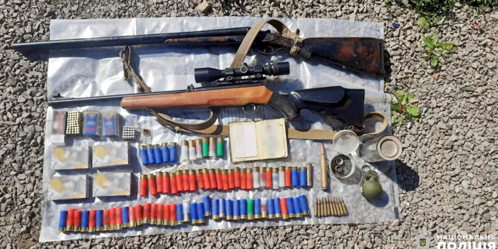 Так вчора, за місцем проживання 32-річного жителя села Томашгород під час обшуку в господарчій будівлі поліцейські виявили та вилучили гранату, 297 патронів різного калібру, дві гвинтівки, одна з яких з пристроєм для прицілювання, порох та каміння бурштину-сирцю.