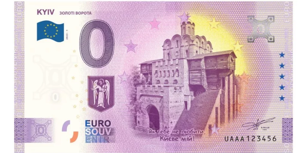 Отже, нині, коли Україна прагне до об’єднання з Європою і популяризує у світі свою багатовікову історію і культуру, у Франції було виготовлено таку лімітовану колекцію євробанкнот номіналом 0 із зображенням Золотих воріт, які є однієї з найвеличніших пам’яток українського народу. У XIII столітті саме ці мури були одним із бастіонів, що стали на шляху Монголо-Татарської навали, тим самим уберігши від неї країни Європи. Примітно, що ця євробанкнота вийшла невдовзі після того, як у квітні 2022 року з’явилася купюра на тему досягнення миру в Україні.