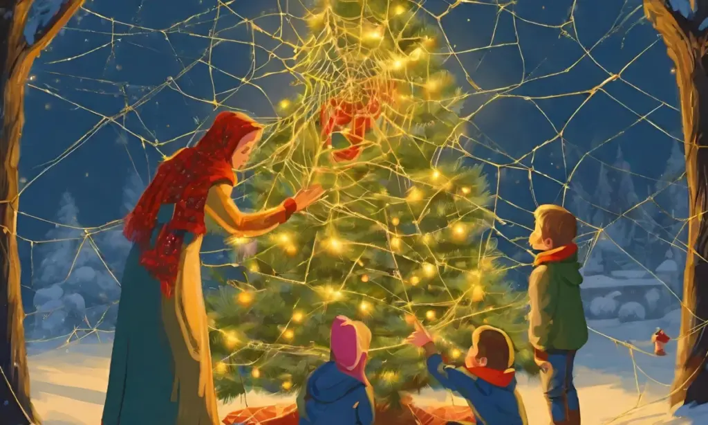 Тоді прийшов Ісус і глянув на ялинку. І що ж він побачив!!! Уся ялинка й усі цяцьки були вкриті павутинням. Це павутиння висіло, як довгі нитки, з кольорових свічок, зі срібних зірок, із золотих дзвіночків, із зелених гілок ялинки.