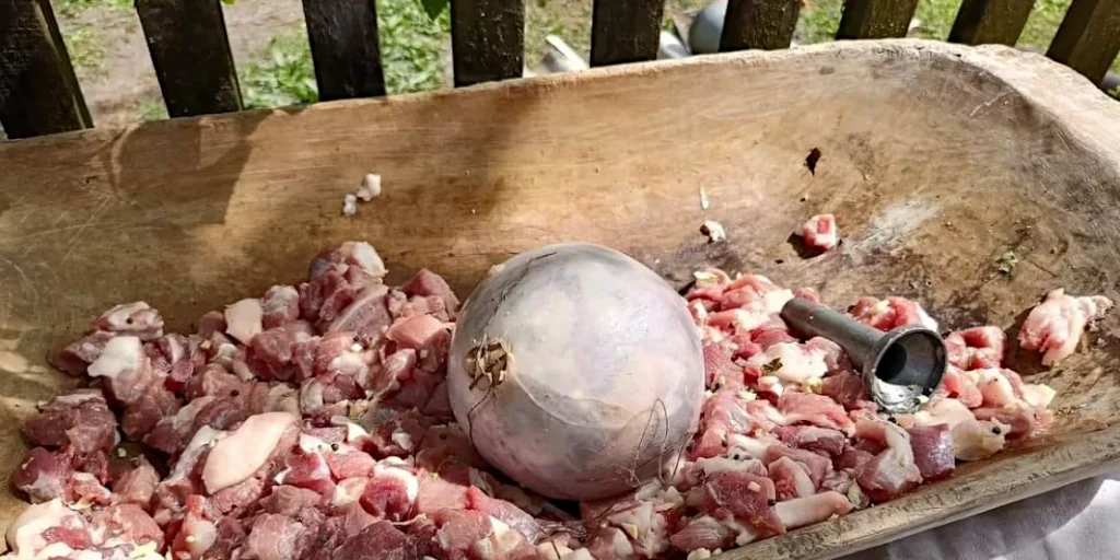 На фрагменті відео – приготування мацика в селі Мульчиці, страву ще називають “каврук”. У свинячий міхур тісно напихають порізане м’ясо, сало, часник, спеції, зав’язують та кладуть у полотняну торбу, далі – підвішують на горищі на пів року.