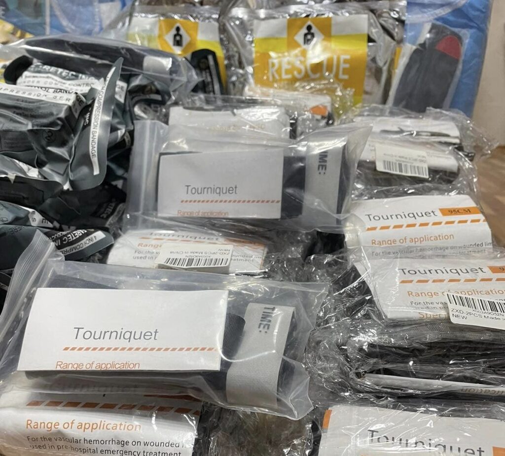 Це медичний вантаж: турнікети, одноразові хірургічні халати, компресійні пов’язки для зупинки кровотечі та інструменти для декомпресії при пневмотораксі. У сортувальному медичному складі медики посортують усе, частину з цих позицій використають для формування бойових аптечок.