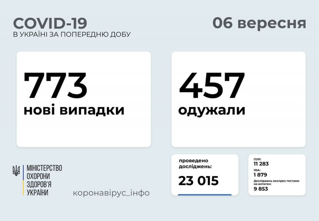 773 нові випадки COVID-19 зафіксовано в Україні станом на 6 вересня 2021 року.