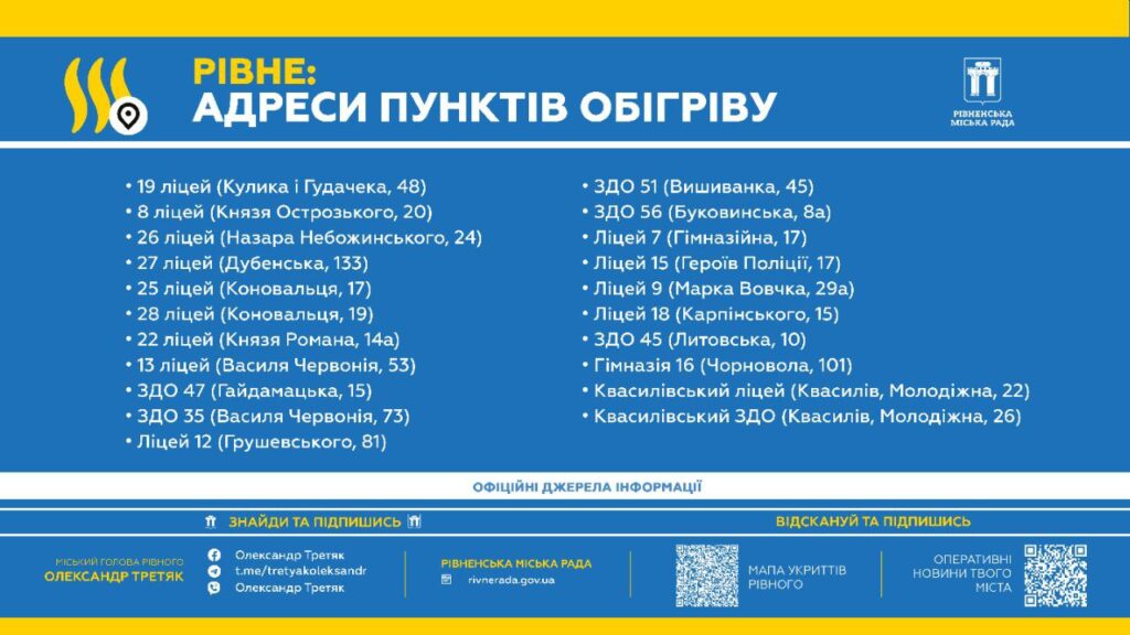 У 21 навчальному закладі (школи та дитсадки) Рівного та селища Квасилів організували пункти обігріву, – повідомив міський голова Рівного Олександр Третяк.