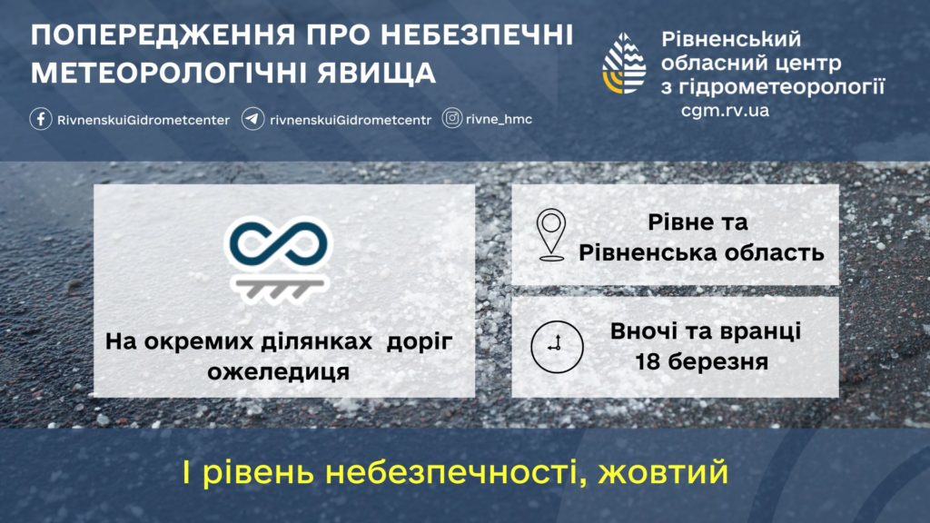 Як повідомляє Рівненський обласний центр з гідрометеорології, вночі та вранці 18березня, по м. Рівне та області на окремих ділянках доріг ожеледиця. Вдень пориви північно-західного вітру 15-20 м/с!