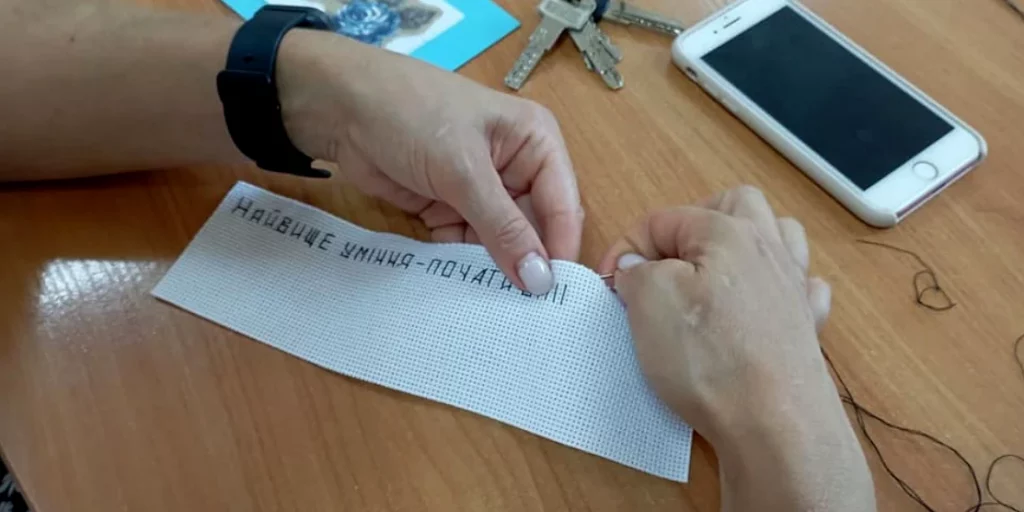 Під час майстер-класу жінки вчилися створювати закладки з цитатами видатних українських діячів, ознайомлюючись із технікою, яку Олена Медведєва використовує для своїх унікальних вишиваних книг.