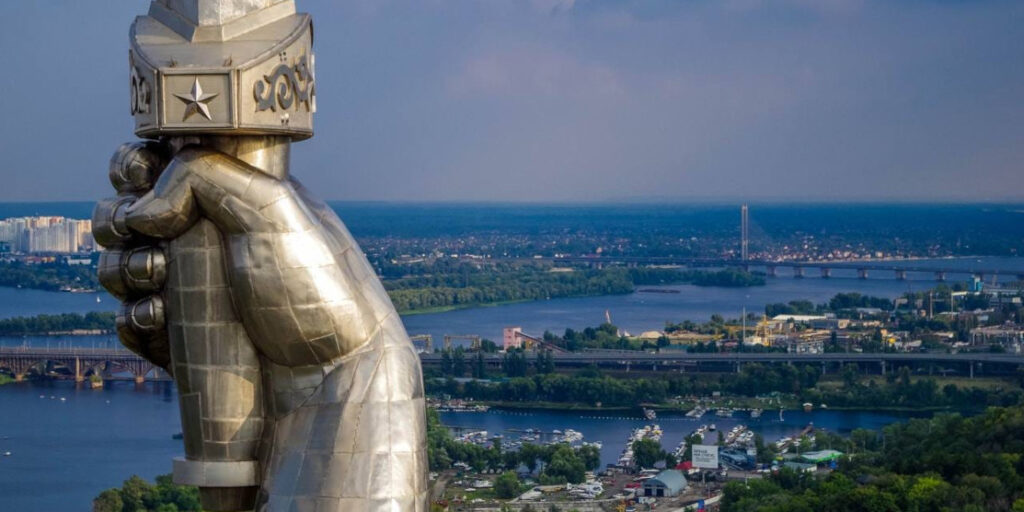 Попри декомунізацію радянського герба на щиті монумента «Батьківщина-Мати», на гарді меча досі залишаються радянські зірки.