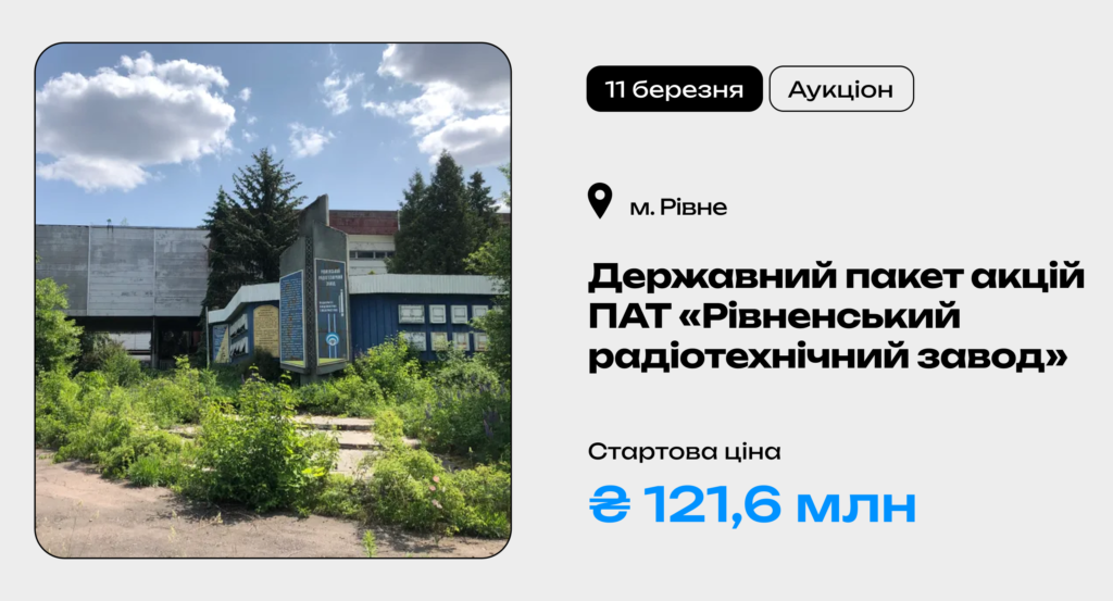 Фонд держмайна запрошує 11 березня взяти участь у приватизаційному аукціоні державного пакета акцій розміром 50 відсотків +1 акція статутного капіталу Публічного акціонерного товариства «Рівненський радіотехнічний завод».
