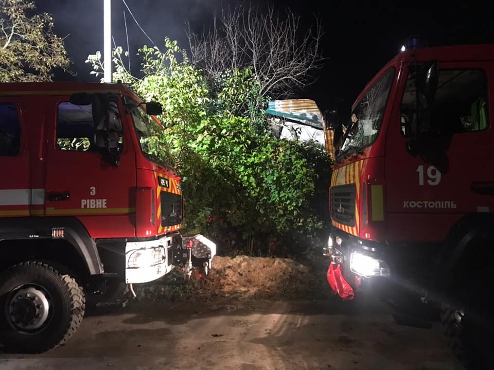 На місце виклику було направлено чергове відділення бійців 19-ї та 3-ї державних пожежно-рятувальних частин з м. Костопіль та м. Рівне.