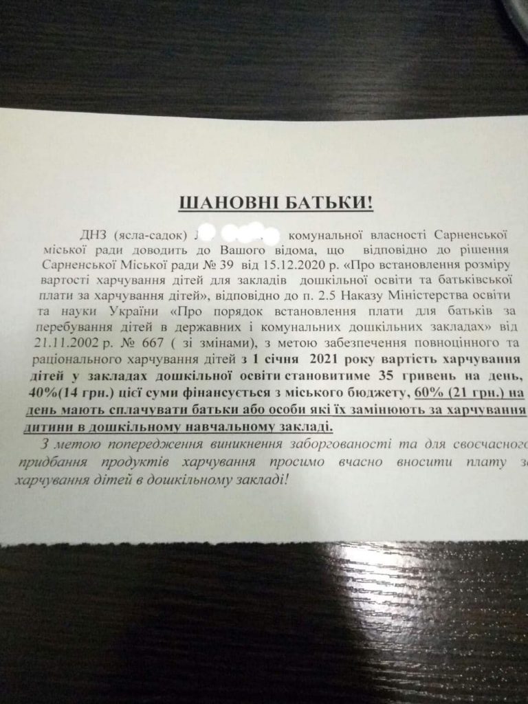 Жителі Сарн у мережі Фейсбук висловлюють “подяку” місцевій владі за підвишення плати за садочок.