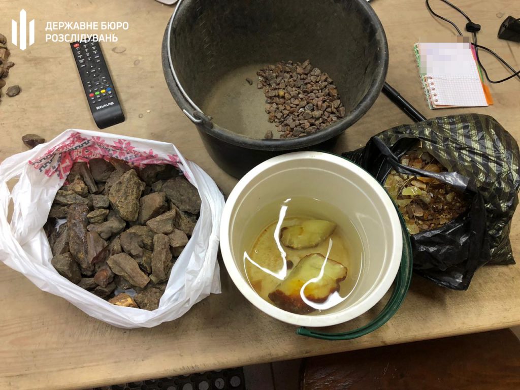 Крім того, у ході обшуків, проведених правоохоронцями за місцем роботи та проживання підозрюваного, а також за місцем можливого незаконного зберігання корисних копалин, виявлено та вилучено понад 150 кілограм бурштину-сирцю, орієнтовною вартістю близько 2,2 мільйона гривень, грошові кошти в сумі 6 820 доларів США та знаряддя для обробітку бурштину.