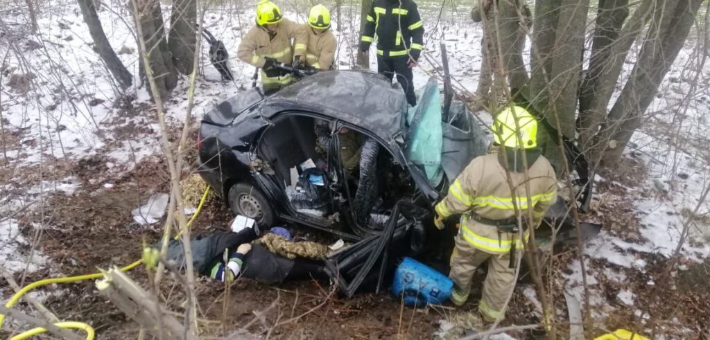 Рівненського району. Надання допомоги по деблокуванню трьох загиблих людей з автомобіля Daewoo Sens після ДТП з вантажним автомобілем Renault Magnum.