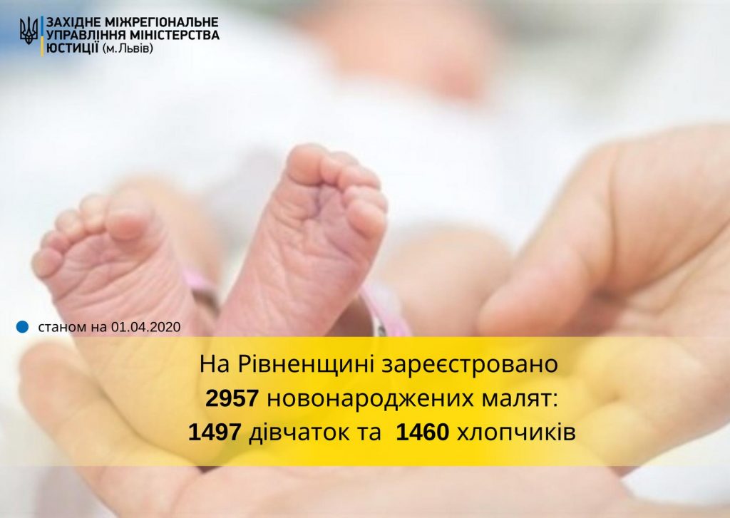 Працівники відділів державної реєстрації актів цивільного стану Рівненської області у першому кварталі 2020 року внесли 2957 актових записів до реєстру про державну реєстрацію народжень. Відтак, в області офіційно зареєстровано 1497 дівчаток та 1460 хлопчиків.