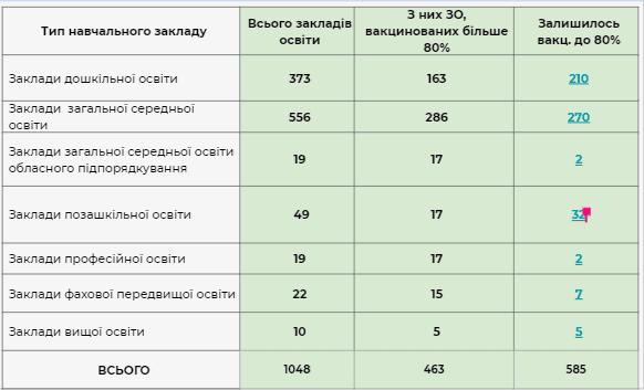 – Наразі система працює в тестовому режимі. У подальшому, натиснувши на останню колонку інтерактивної таблиці, можна буде побачити перелік закладів, які ще не досягнули межі у 80% вакцинованих працівників, – розповів начальник управління освіти та науки ОДА Петро Коржевський.