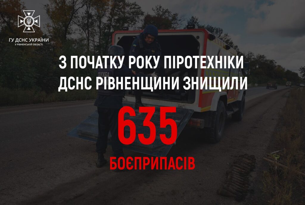 З початку 2022 року групою піротехнічних робіт аварійно-рятувального загону спеціального призначення ГУ ДСНС на території Рівненщини було знищено 635 боєприпасів.