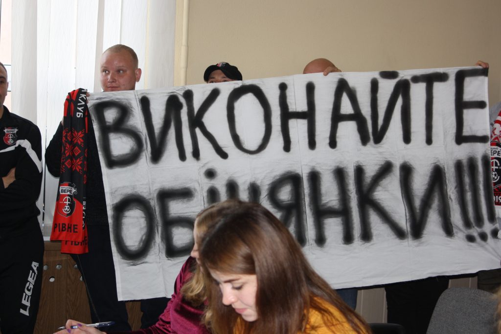 Уболівальники НК «Верес» на пленарне засідання до депутатів Рівненської міськради прийшли з транспарантами і проханням врешті-решт виділити обіцяні три мільйони гривень на утримання команди.