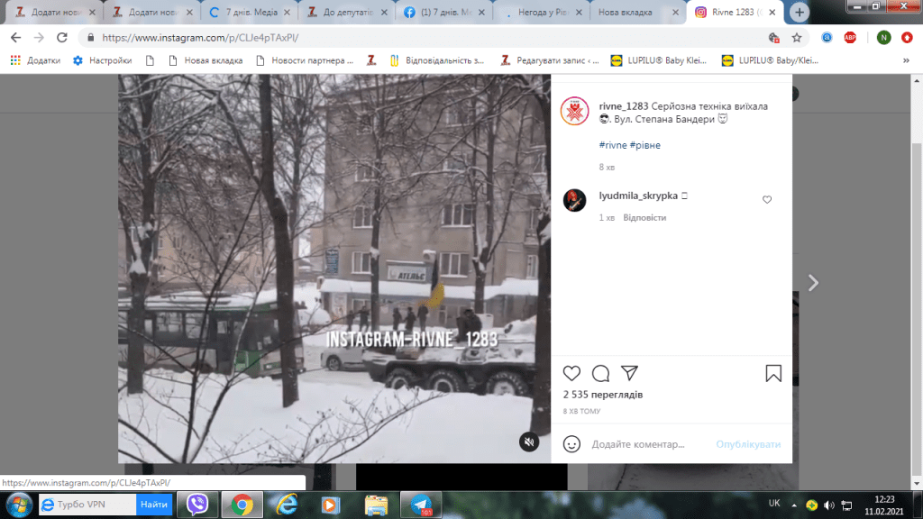 Приклад допомоги військових показали в інстаграмі в групі Rivne_ 1283. Військова техніка виконує буксирування тролейбуса на вулиці Степана Бандери.