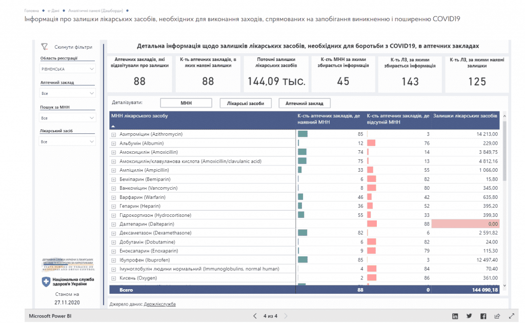 Дашборд створено на основі даних ДП «Медичні закупівлі» (інформація про залишки ліків у закладах охорони здоров’я) та Держлікслужби (залишки за аптечними мережами). Усі дашборди НСЗУ можна переглянути за посиланням