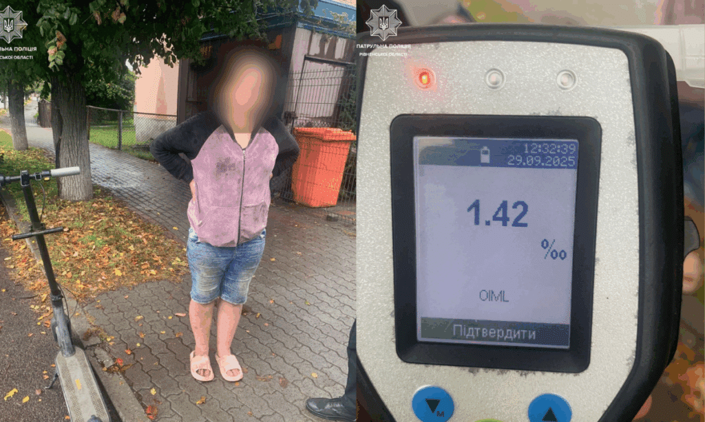 Учора, 29 вересня, патрульні Сарн помітили на вулиці Соборній електросамокат, водійка якого рухалася хаотично, створюючи небезпеку для себе та інших учасників руху. Під час спілкування з 24-річною жінкою інспектори виявили ознаки алкогольного сп’яніння. Вона погодилася пройти огляд на місці за допомогою алкотестера, який показав результат 1,42 проміле.