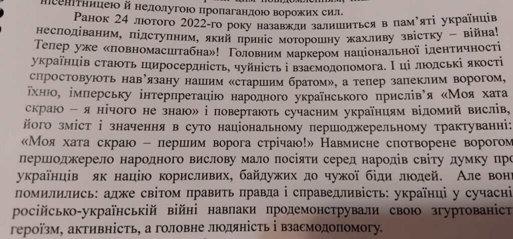 Ранок 24 лютого 2022-го року назавжди залишиться в пам’яті українців несподіваним, підступним, який приніс моторошну жахливу звістку — війна! Тепер уже «повномасштабна»! Головним маркером національної ідентичності українців стають щиросердність, чуйність і взаємодопомога. І ці людські якості спростовують нав’язану нашим «старшим братом», а тепер запеклим ворогом, їхню, імперську інтерпретацію народного українського прислів’я «Моя хата скраю — я нічого не знаю» і повертають сучасним українцям відомий вислів, його зміст і значення в суто національному першоджерельному трактуванні: «Моя хата скраю — першим ворога стрічаю!» Навмисне спотворене ворогом першоджерело народного вислову мало посіяти серед народів світу думку про українців як націю корисливих, байдужих до чужої біди людей. Але вони помилились: адже світом править правда і справедливість: українці у сучасній російсько-українській війні навпаки продемонстрували свою згуртованість, героїзм, активність, а головне людяність і взаємодопомогу.