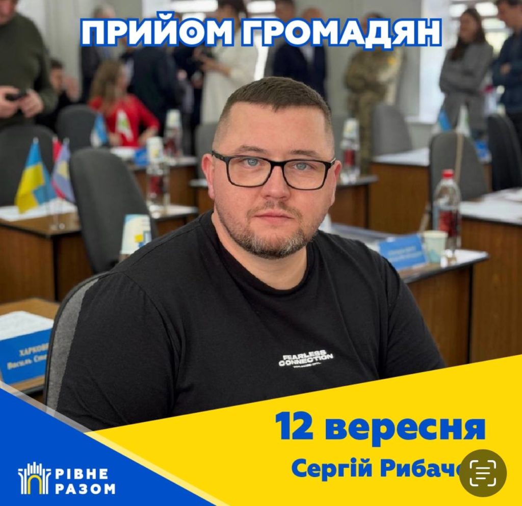 У четвер, 12 вересня, в громадській приймальні «РІВНЕ РАЗОМ», що за адресою: м.Рівне, вул. Соборна, 13, особистий прийом громадян проведе депутат Рівненської міської ради, член постійної комісії з питань охорони здоров’я, материнства і дитинства та соціального захисту населення, захисту учасників бойових дій і членів сімей загиблих героїв Небесної сотні та учасників бойових дій Сергій Рибачок.