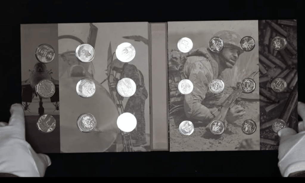 Набір «Монети України 2025» містить обігові монети номіналами від 50 копійок до 10 гривень, а також пам’ятні монети, присвячені Національній гвардії, Силам безпілотних систем ЗСУ, Нацполіції та ДСНС.
