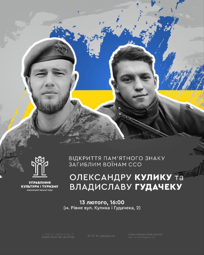 На честь Олександра Кулика та Владислава Гудачека у Рівному відкривають пам’ятний знак сьогодні, 13 лютого, о 16 годині.