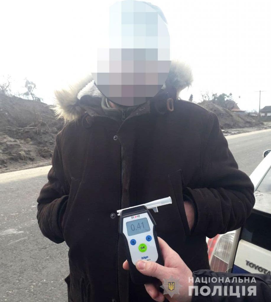 Також поблизу села Тучин поліцейські відділення поліції №3 (смт Гоща) зупинили автомобіль «Mercedes-Benz», який рухався без увімкнених фар поза межами населеного пункту. Під час перевірки на стан сп’яніння водія, 56-річного рівнянина, алкотестер показав 0,41 проміле.