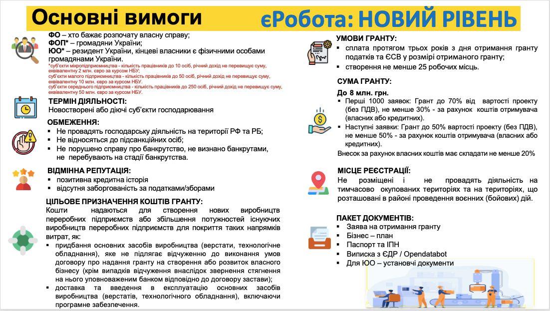 Разом із запуском програми грантового фінансування уряд запускає реформу всієї сфери зайнятості у партнерстві з Ощадбанком. Адже при отриманні гранту, автоматично виникають і зобов’язання перед державою, такі як створення певної кількості робочих місць, сплати податків, безперебійної роботи підприємства.