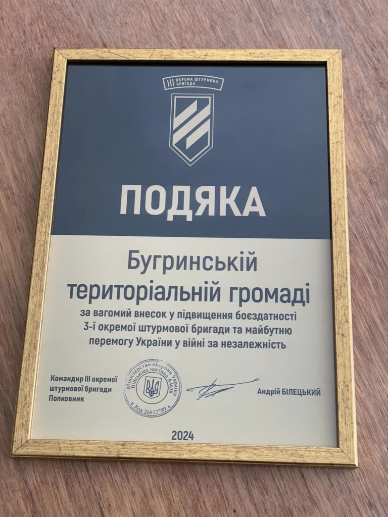 Бугринська громада отримала Подяку від командира 3-ї окремої штурмової бригади, полковника Андрія Білецького, за внесок у підвищення боєздатності бригади та майбутню перемогу України.