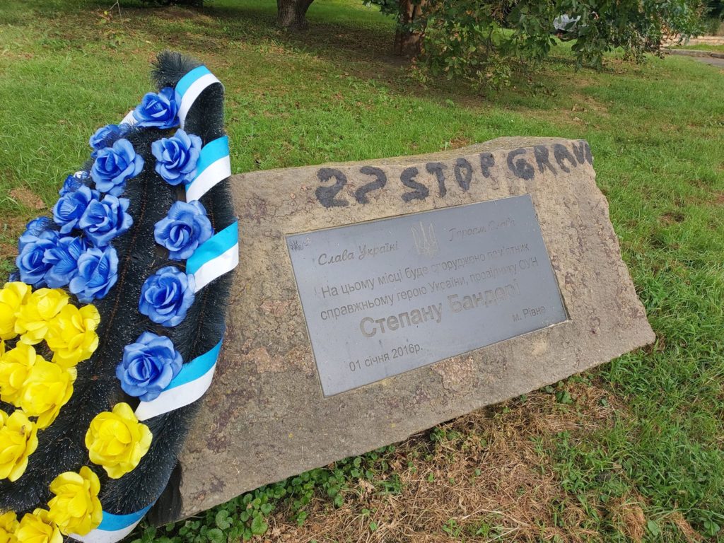 “Сьогодні помітила, що наріжний камінь Степану Бандері, а також вхід до парку ім.Т.Г.Шевченка невідомі спаплюжили своїм розписом. І це все у людному місці… і ця мерзота вільно ходить нашим містом. Щиро сподіваюсь, що не довго.”