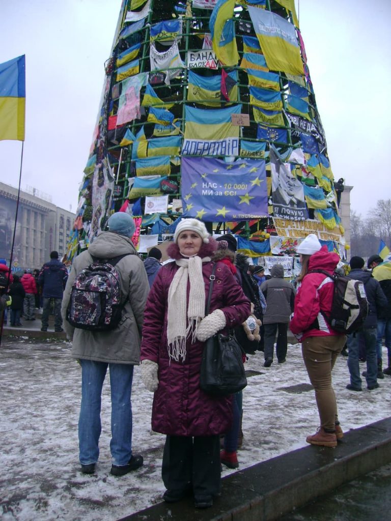 Без вагань вирішила поїхати туди, як побачила по телевізору побиття студентів беркутівцями. Перша поїздка припала на 8 грудня. Коли з групою рівнян прибули на майдан, то побачила багато людей, котрі рухалися прилеглими вулицями. Волонтери пропонували нам гарячий чай і бутерброди, скрізь панувала доброзичлива атмосфера. Познайомилися з рівнянами, які там уже жили в наметах. Увагу привернула знаменита йолка, яку майданівці прикрасили своїми атрибутами. І тут зі сцени лунає Гімн України у виконанні Руслани. Усі припинили роботи. Людське море, яке заповнило майдан, заспівало разом зі співачкою. Я вперше у своєму житті почула цей потужний народний голос! Співаю разом з усіма й відчуваю, як по тілу «побігли мурашки». Аж тут розумію: хіба знайдеться безумець, що зможе протистояти такій могутній силі? Тоді навіть припустити не могла, як я помиляюся. З’явилася упевненість, що невдовзі все вирішиться позитивно. Бо хіба можна проігнорувати бажання стількох людей? Статисти припускали, що того дня було більш як 500 тисяч, та уявлялося, що людей було безліч.