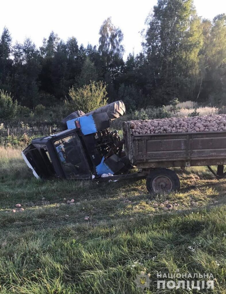 Вчора, 8 вересня, о 18:10 до поліції надійшло повідомлення від медиків про те, що в селі Буша колишнього Здолбунівського району поблизу ферми перекинувся трактор. СОГ попередньо встановила, що під час спуску з гірки на ґрунтовій дорозі перекинувся трактор, який перевозив картоплю на саморобному причепі.