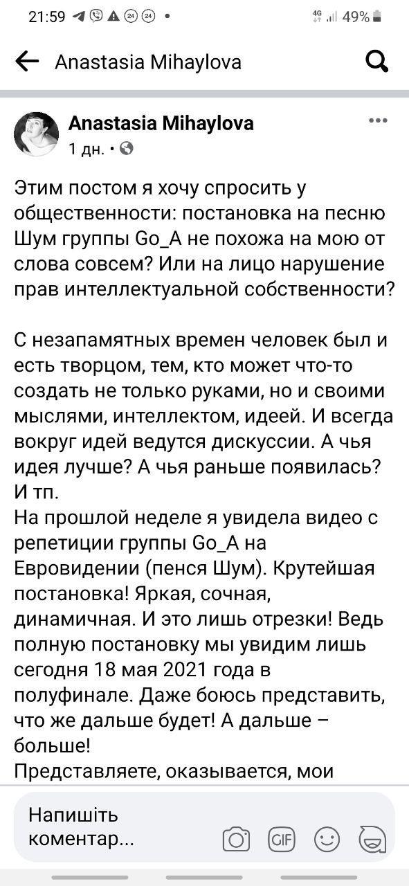 Михайлова розповіла, що взяла участь у конкурсі на розробку ідеї кліпу для гурту Go_A на пісню SHUM. Вона надіслала Суспільному свій сценарій та захистила ідею перед комісією. Згодом вона дізналась, що конкурс виграв хтось інший.