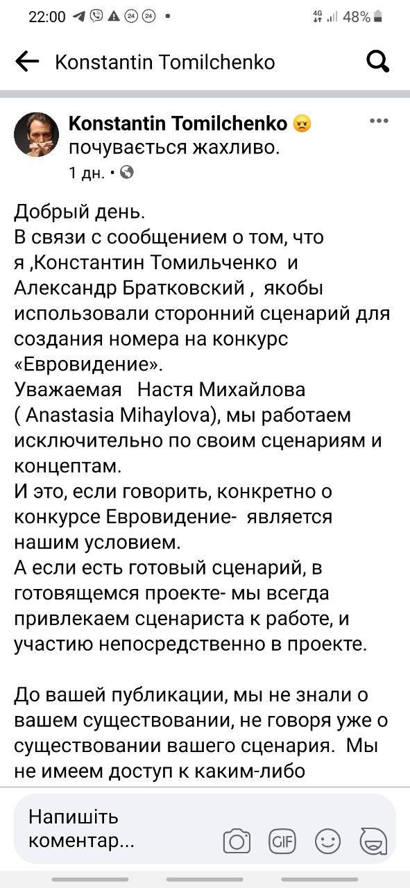 «До вашої публікації ми не знали про ваше існування, не кажучи вже про існування вашого сценарію. Ми не маємо доступу до будь-яких сценаріїв або творчих розробок телеканалів, оскільки на ринку працюємо фрілансерами. Переглянувши ваш пост, ми не розуміємо, яке відношення ваша ідея кліпу має до нашої сценічної постановки на „Євробаченні“. Крім притягнення за вуха», — зауважив Томільченко.