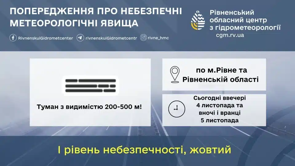 Синоптики надали прогноз погоди для Рівненщини на 5 листопада. У середу буде хмарно з проясненнями. Вночі невеликий дощ. Вдень без опадів. Через сильний туман з обмеженою видимістю вночі та вранці оголошено I рівень небезпеки.