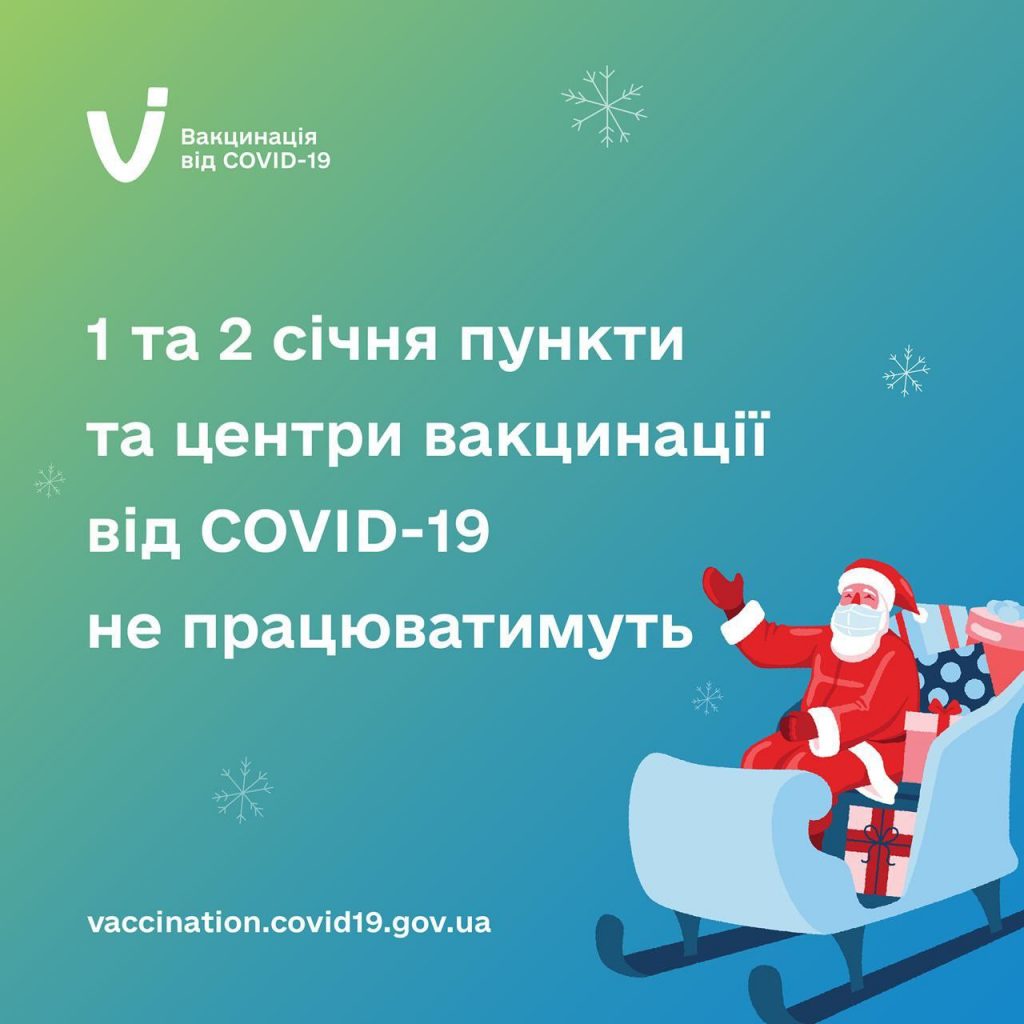 1 та 2 січня пункти та центри вакцинації населення проти COVID-19 в Україні будуть зачинені.