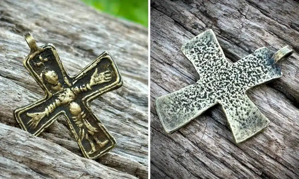 Хрест, датований XI століттям, є винятковим свідченням ранніх культурних і торгівельних зв’язків між Волинню та країнами Північної Європи. Артефакт належить до сакральних символів скандинавського типу – чотирикінцевий, з характерними розширеними раменами та масивним вушком для кріплення. Виготовлений із бронзи у техніці лиття, він зберіг благородну патину, що підкреслює його давність.