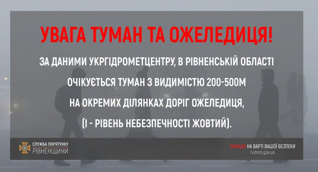 За повідомленням Українського гідрометеорологічного центру, на території Рівненської області ввечері 18 грудня, вночі, та вранці 19 грудня, очікується туман з видимістю 200 – 500 м, на окремих ділянках доріг ожеледиця (І рівень небезпечності жовтий).
