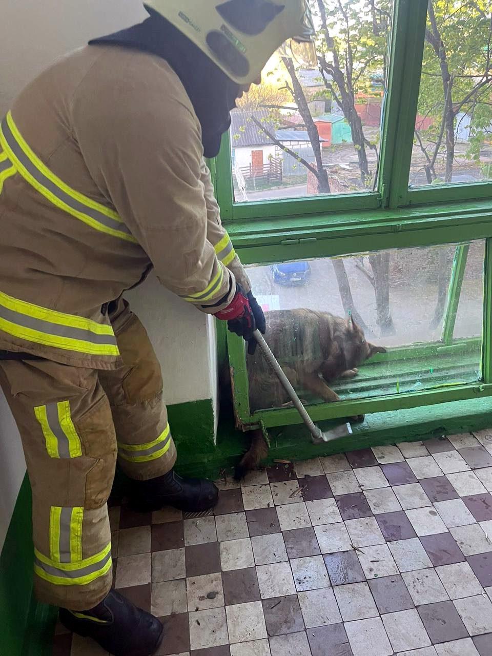 За допомогою спеціального інструменту співробітник ДСНС відкрив вікно та дістав чотирилапого друга. На щастя з песиком все добре.