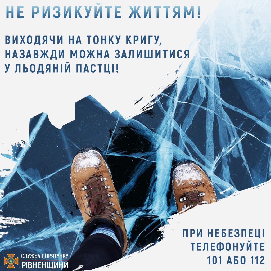 Рятувальники Рівненщини попереджають: в жодному разі не можна перевіряти товщину криги ударом ноги, варто взяти палицю, щоб перевірити міцність льоду.